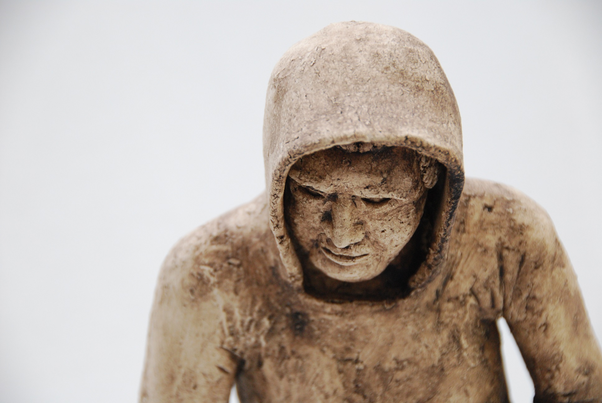 The sculptures are ceramic stoneware with manganese dioxide stain. Standing figures are approx 35 cm tall, seated approx 20 cm.